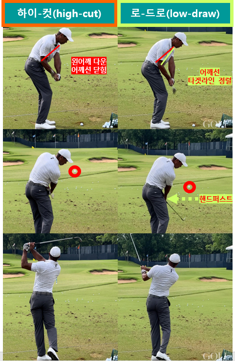 2022년 5월 골프잡지 골프매거진 코리아는 2022년 PGA챔피업십을 앞두고 웨지샷을 연습하는 타이거 우즈의 자세를 분석하는 기사를 게재했다. 언뜻 보기에 분간하기가 쉽지 않지만, 다운스윙 자세를 하이컷(high-cut)과 로드로(low-draw)로 구분하고 있다. 다운스윙에서 오른팔꿈치·왼어깨는 도르레와 유사하게 작용한다.