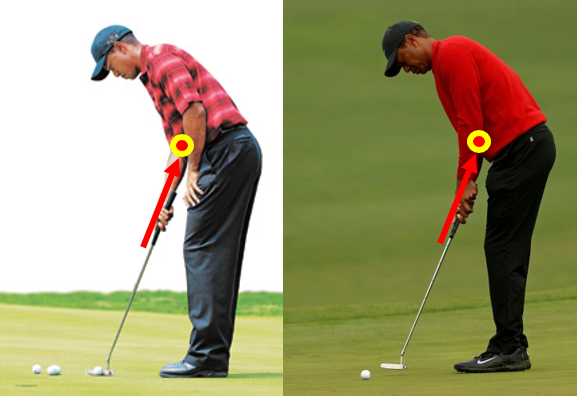경직된 오른팔을 움직이기 위해서는 어깨를 움직일 수 밖에 없다. 퍼트는 지면에서 헤드를 띄워놓고 스트로크하는 것은 맞으나, 경험상 지면에서 떼면서 스트로크하는 것이 좋다. 지면에서 띄운 상태를 오래 유지하는 것이 양팔의 근육을 경직시킬 수 있기 때문이다. 개인적으로 타이거우즈의 퍼팅드릴에 숨겨진 진실은 그립버트의 연장선과 오른팔꿈치의 접점에 있지 않을까 한다.