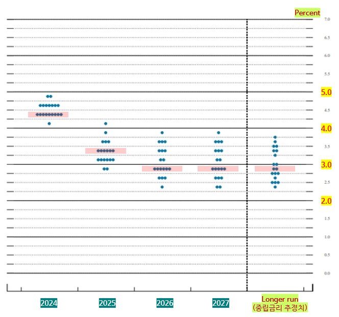 3년에 걸쳐서 2.5%p를 내린 후, 이번 금리인하 사이클을 마무리하겠다는 의미이다. 물론 향후 FOMC에서 계속 바뀔 가능성이 높은 숫자이지만, 우리가 볼 것은 방향성(추세)이다.