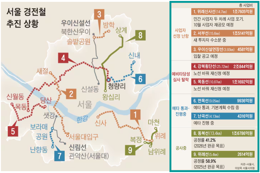 재정사업으로 전환하기 위해서는 서울시 제2차 도시철도망 구축계획을 변경해야 하는데, 2025년 상반기 국토교통부의 승인을 얻을 예정이라고 한다. 국토교통부를 통과하면 기재부의 예타를 거쳐야 한다. 이렇듯 재정투자사업은 시간이 오래 걸릴 뿐만 아니라, 예타 통과를 장담할 수 없다는 단점이 있다.