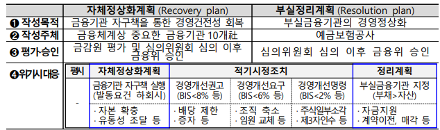 금융산업의 구조개선에 관한 법률(금산법)은 금융기관의 합병·전환 또는 정리 등 금융산업의 구조개선을 지원하여 금융기관 간의 건전한 경쟁을 촉진하고, 시장상황의 급격한 변동에 따라 금융기관의 일시적 유동성의 부족 등으로 금융의 중개기능이 원활하지 못한 경우에 금융기관의 자본확충 등을 위하여 신속하게 자금지원을 하여 금융업무의 효율성을 높임으로써 금융산업의 균형있는 발전과 금융시장의 안정에 이바지함을 목적으로 한다. 금융당국은 금산법의 목적을 달성하기 위해, 다음과 같이 위기대응 3단계 플로우를 구축하고 있다.