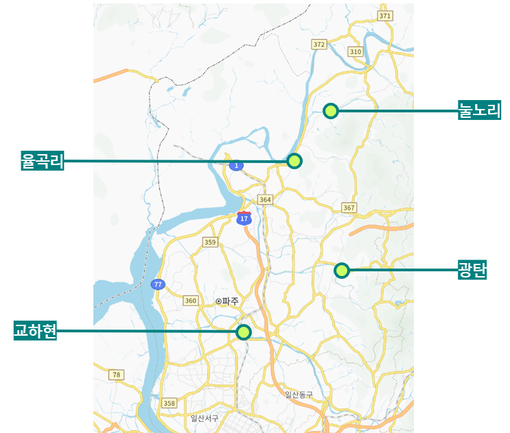 이전 글 <오래 전 글로 피어난, 파주>에서 파주라는 지명은 1459년(세조 5) 목(牧)으로 승격되면서 개칭되었다고 언급했었다. 757년 신라(경덕왕)의 점령 이후 교하로 불리기 시작했는데, 조선시대 교하현(현 금릉동·교하동)은 공릉천을 따라 형성되었다. 교하(交河, 하천이 만남)는 서쪽의 한강와 동쪽의 임진강이 합류하여 서해로 들어간다고 하여 붙여졌다. 1535년 성혼은 한성(현 순화동)에서 태어났지만, 아버지 성수침(파산학파)을 따라 눌노리(현 파평면)으로 이사했다. 성혼은 인근의 율곡리에 머물던 이이와 교류가 잦았다. 광탄(廣灘, 넓은 여울)은 양주의 2개면(백석·광적)에서 흘러내린 물줄기가 문산천에서 합류하면서 큰 여울이 생겼다는데서 유래되었다.
