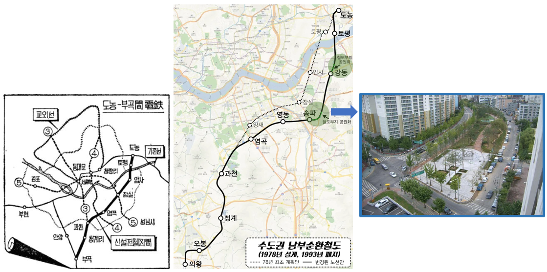 문정역(서울지하철 8호선) 3번 출구로 나와, 길 건너 편을 바라보면 선형의 문정근린공원이 보인다. 2011년 서울시는 남부순환철도의 철도부지 일부를 문정근린공원로 조성했는데, 지적편집도상 지목은 철(철도용지)이다. 주택가가 들어서기 전에, 이미 철도가 부설되어 있었다는 사실을 알고 문정근린공원을 바라보면, 녹지 속에서 기차를 상상하게 된다.남부순환철도는 남부순환선·남부교외선으로도 부르며, 크게 다음 2개의 시기로 구분된다.