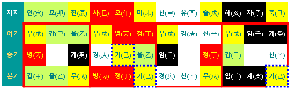 연상문구를 만들어서 억지로 외우는데, 이전 글 <초인적인 뭔가, 사주팔자>에서 천간 10자를 오행·음양으로 나타낸 그림을 연상하면 수월하게 외울 수 있다. 일단 생지의 지장간은 양간으로만 구성되는데, 무토에서 시작하여 지지의 오행과 일치하는 천간이 본기가 된다. 이 때 중기는 본기의 오른쪽 글자이다. 묘지의 지장간은 왕지의 본기로 시작하는데, 전월의 음간을 중기로 하여 토(무토·기토)에 도달한다. 생지·묘지의 중기는 토(무토·기토)를 넘어간다. 왕지의 지장간은 그 계절을 나타내는 천간 2글자로 구성되지만, 오화(여름)에는 중기에 기토가 들어간다. 서두에서도 언급했지만, 토의 해석이 매우 중요하다는 것을 느낄 수 있다.