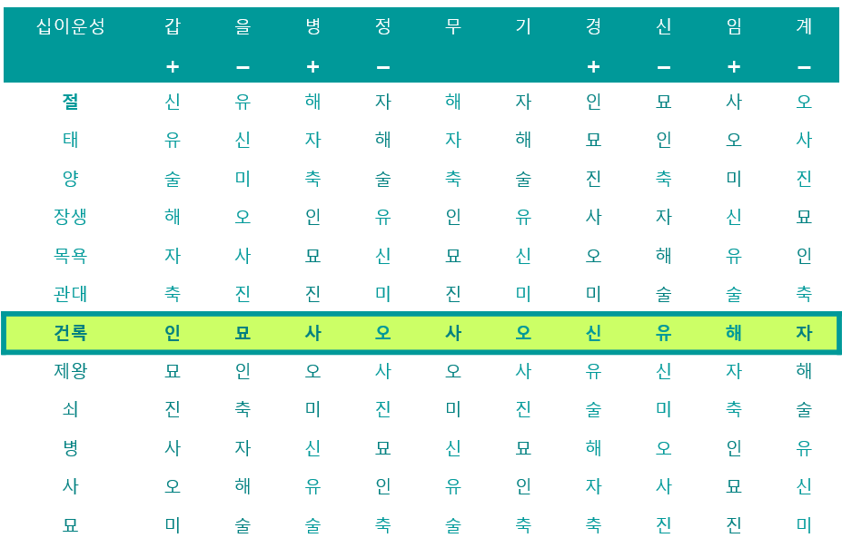 십이운성은 건록을 기준으로 외우는 것이 쉬운데, 천간의 토을 제외하고는 천간·지지의 음양오행이 일치하기 때문이다. 음간의 십이운성은 반대로 간다는 점에 유의해야 한다.