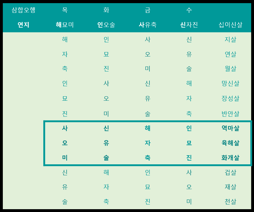 십이신살은 지살로 외우는 것이 좋은데, 지살이 삼합의 왕지에서 시작하기 때문이다. 기회를 누리는 망신살·장성살·반안살은 오행의 방합과 일치한다는 부분을 알면 더 쉽게 파악이 된다.