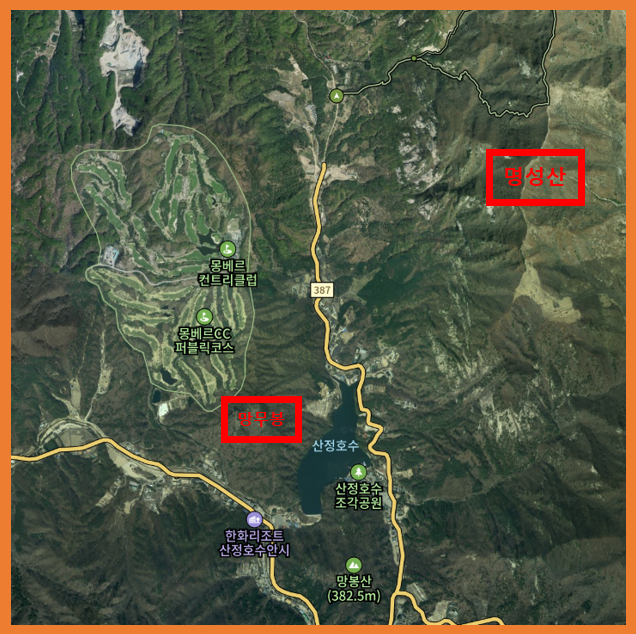 명성산(鳴聲山, 울음산)은 왕건과 싸우다 쫓긴 궁계가 서글프게 통곡하자, 산도 같이 울었다고 하여 지어진 이름이다. 망무봉(望武峯)은 궁예가 부하를 시켜 망을 보게한 봉우리로, 신령스러운 기암괴석이다. 결국 궁예는 명성산에서 피살된 것으로 전해지고 있다.몽베르CC 코스에서 남근석이라는 기괴한 대형 자연석이 서 있었는데, 범상치 않은 기운의 공간이라는 느낌을 확실히 받았다. 몽베르CC에서 바라보면, 망무봉 뒤에 산정호수가 있다. 산정(山井, 산 속의 우물)호수는 영북농지개량조합이 농업용수 확보 목적으로 산중에 조성(1925년)한 인공저수지로, 1977년 국민관광지로 지정되었다.