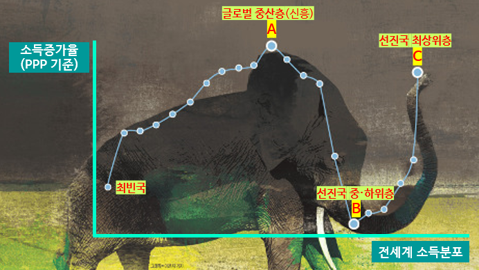 브랑코 밀라노비치(뉴욕시립대 대학원 석좌교수)는 1988~2011년(세계화) 동안 글로벌 소득수준에 따른 실질소득증가율을 그래프를 통해 보여줬는데, 그래프의 모양이 코끼리와 유사하다과 하여 코끼리 곡선(Elephant Curve)라고 불렀다. 세계화 기간 동안 고소득국 중·하위층이 뒤처진 반면, 글로벌 중산층(신흥)과 최상위층이 막대한 부를 일궜다. 또한 국가(선진국) 내의 불평등은 심해졌지만, 국가(선진국·신흥국) 간의 불평등은 축소되었다. 이는 통신·교통의 발전으로 선진국 기업이 저렴한 인건비를 찾아 공장을 해외로 이전했기 때문이다.