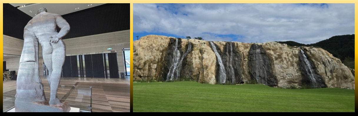 골프장마다 정체성을 나타내는 조각상이나 설치물이 있는 경우가 많은데, 벨라45CC 클럽하우스 중앙에 위치한 헤라클레스상은 10원 동전(총 50만 개)로 만들어졌다. 헤라클레스에는 다음의 글귀가 있는데, 대략 골프는 힘으로 되는게 아니라는 의미인듯 하다.